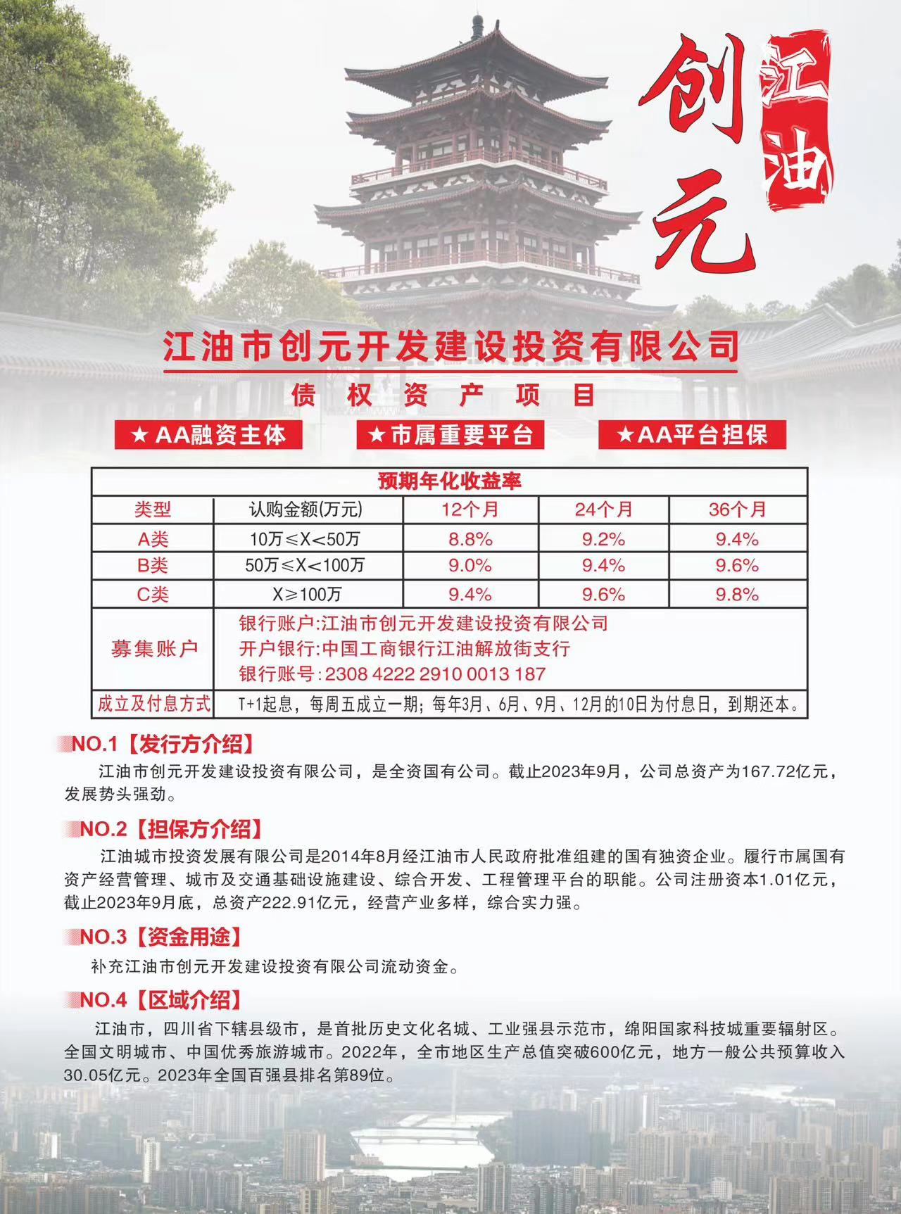 江油市创元开发建设投资有限公司债权资产项目资料 linbin123456 2024-04-07 204 0 微信号:18321177950添加微信好友, 获取更多信息复制微信号江油市创元开发建设投资有限公司债权资产项目.txte942e43e84835bbd43fe011d6979c34.jpg认购协议-江油创元(wb).pdf资产交易说明书-江油创元(wb).pdf << 陕西AK高新CF债权资产资料 湖州织里产业投资运营集团有限公司债权计划 >> 您可以还会对下面的文章感兴趣: 暂无相关文章 相关文章 广西崇左城建资产运营2025债权资产项目资料 广西崇左城建资产运营2025债权资产项目 河源市江东新区公用事业有限公司2025年债权资产1期—河源市江东新区公用事业有限公司2025年债权资产2期资料 河源市江东新区公用事业有限公司2025年债权资产1期—河源市江东新区公用事业有限公司2025年债权资产2期风险评估 罗山县宝城建设投资有限责任公司债权拍卖项目资料 XX市XX古城建投2025年债权资产转让1期-XX市XX古城建投2025年债权资产转让4期资料 荆门东宝城投2025年债权资产1期—荆门东宝城投2025年债权资产2期资料 宿松交通建设投资2025年债权资产资料