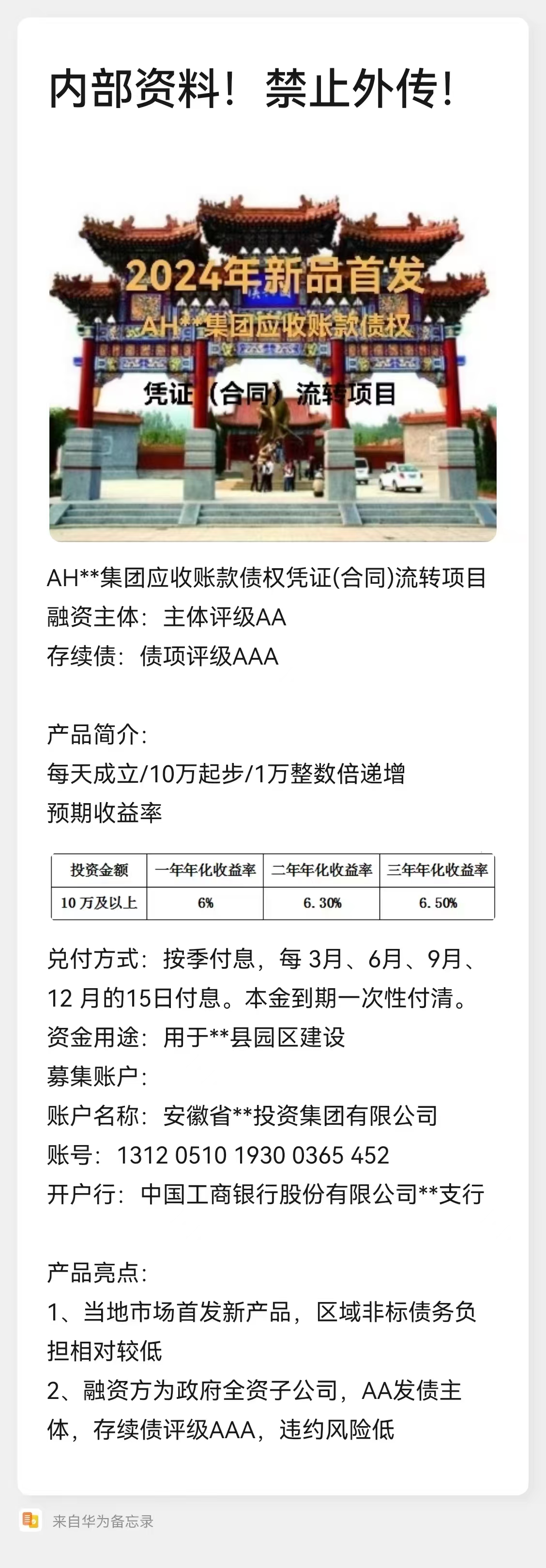 梨都集团2024年应收账款转让项目资料 linbin123456 2024-10-15 26 0 微信号:18321177950添加微信好友, 获取更多信息复制微信号梨都集团2024年应收账款转让项目.txt梨都集团董事会决议.pdf9267368070617f62a5b8b5ebc196505.jpg梨都认购协议.pdf << 河北邢台市租赁资产委托认购项目 重庆江津城市开发建设发展有限公司债权资产01-02资料 >> 您可以还会对下面的文章感兴趣: 暂无相关文章 相关文章 广西崇左城建资产运营2025债权资产项目资料 广西崇左城建资产运营2025债权资产项目 河源市江东新区公用事业有限公司2025年债权资产1期—河源市江东新区公用事业有限公司2025年债权资产2期资料 河源市江东新区公用事业有限公司2025年债权资产1期—河源市江东新区公用事业有限公司2025年债权资产2期风险评估 罗山县宝城建设投资有限责任公司债权拍卖项目资料 XX市XX古城建投2025年债权资产转让1期-XX市XX古城建投2025年债权资产转让4期资料 荆门东宝城投2025年债权资产1期—荆门东宝城投2025年债权资产2期资料 宿松交通建设投资2025年债权资产资料