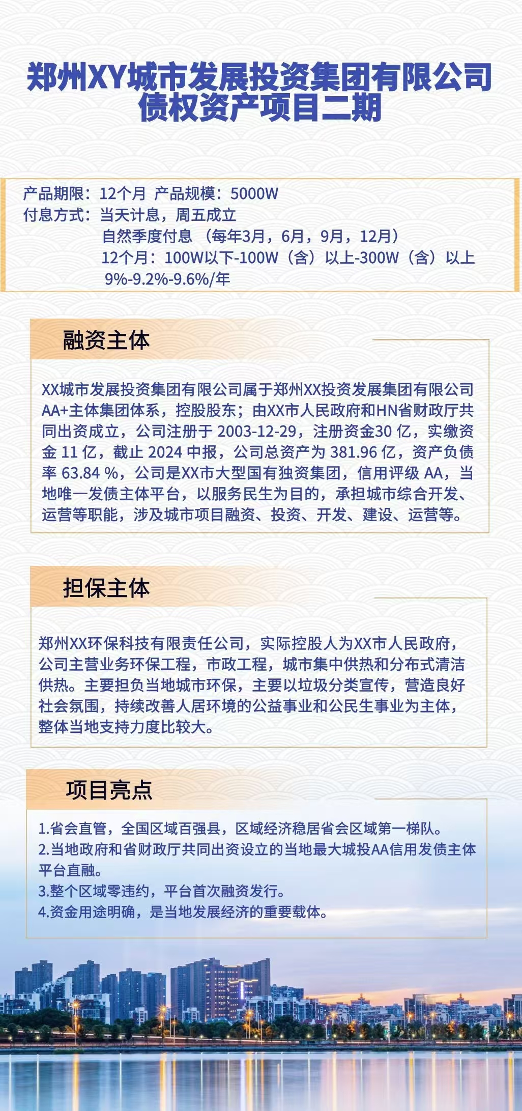 荥阳城市发展投资集团有限公司债权资产项目二期资料 linbin123456 2024-10-17 45 0 微信号:18321177950添加微信好友, 获取更多信息复制微信号XXX城市发展项目介绍.pdf荥阳城市发展投资集团有限公司债权资产项目二期.txt101a05c51fcd1783e897df697b5585f.jpgXXXX发展投资集团有限公司2024年评级报告.pdf << 石家庄元氏县元昌投资集团2024融资计划资料 荥阳城市发展投资集团有限公司债权资产项目二期 >> 您可以还会对下面的文章感兴趣: 暂无相关文章 相关文章 广西崇左城建资产运营2025债权资产项目资料 广西崇左城建资产运营2025债权资产项目 河源市江东新区公用事业有限公司2025年债权资产1期—河源市江东新区公用事业有限公司2025年债权资产2期资料 河源市江东新区公用事业有限公司2025年债权资产1期—河源市江东新区公用事业有限公司2025年债权资产2期风险评估 罗山县宝城建设投资有限责任公司债权拍卖项目资料 XX市XX古城建投2025年债权资产转让1期-XX市XX古城建投2025年债权资产转让4期资料 荆门东宝城投2025年债权资产1期—荆门东宝城投2025年债权资产2期资料 宿松交通建设投资2025年债权资产资料